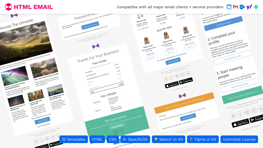 You'll immediately receive HTML, CSS + SCSS for 10 email templates